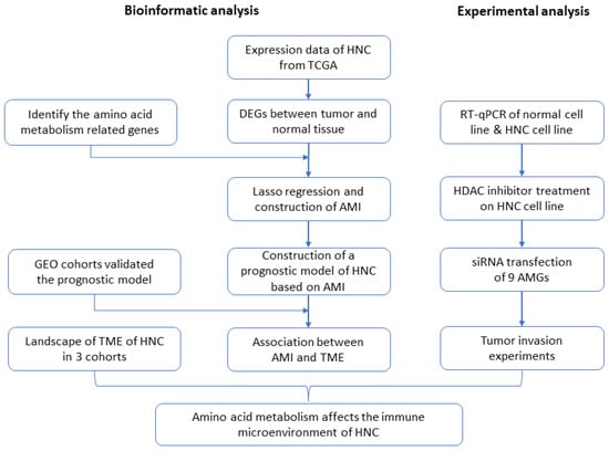 Flow chart of the experimental milestones of the current project. (HNC = head and neck cancer, AMGs = amino acid metabolism-related genes, DEGs = differentially expressed genes, TCGA = The Cancer Genome Atlas, AMI = amino acid metabolism index, GEO = Gene Expression Omnibus, TME = tumor microenvironment, HDAC = histone deacetylase).
