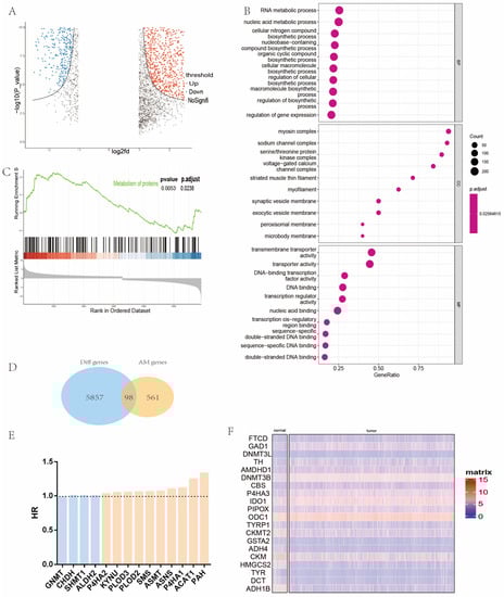 Identification of prognostic AMGs in patients with HNC. (A) Volcano plot of differentially expressed genes in the TCGA-HNC cohort. (B) GO analysis of differentially expressed genes (cellular nitrogen compound biosynthetic process, macromolecule biosynthetic process, cellular macromolecule biosynthetic process, regulation of biosynthetic process, and regulation of cellular biosynthetic process are associated with amino acid metabolism). (C) GSEA analysis of differentially expressed genes. (D) Venn diagram exhibiting 98 DEGs among AMGs. Red means positively correlated and blue means negatively correlated. (E) Fourteen prognostic AMGs. (F) Representative 20 (BP = biological process, CC = cellular component, MF = molecular function, HR = hazard ratio, HNC = head and neck cancer, AMGs = amino acid metabolism-related genes, DEGs = differentially expressed genes, GO = gene ontology, KEGG = Kyoto Encyclopedia of Genes and Genomes, TCGA = The Cancer Genome Atlas).