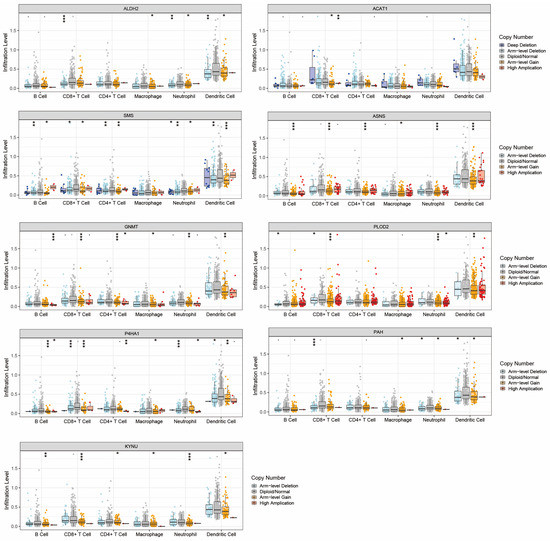 Mutations of these nine genes in immune cells from HNC samples were also displayed (Figure 4). KYNU, ASNS, GNMT, and P4HA1 all showed statistically significant mutations in the six dominant immune cells. SMS was mutated in five types of immune cells, while PAH, ALDH2, and PLOD2 were mutated in four types of immune cells. ACAT1 was mutated only in CD8+ T cells. They may largely affect the normal function of these immune cells, thereby contributing to the generation of immunosuppressive microenvironment. Therefore, our subsequent studies will focus on the tumor immune microenvironment of HNC.