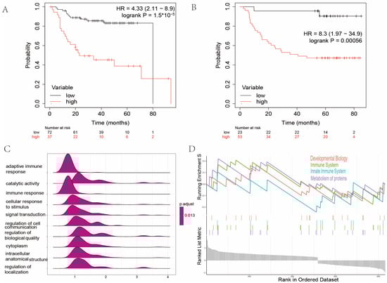 The multivariate Cox regression model was constructed with the nine AMGs, and the regression coefficients were calculated. The AMI for each HNC sample was calculated as follows: AMI = Σ Gi × βi (Gi represents the expression level of each AMG, and βi represents the corresponding regression coefficient). We adopted the TCGA cohort as a training set to develop a prognostic model. Subsequently, two GEO cohorts served as verification sets to test the predictive power of this model. The patients in GEO cohorts were divided into high and low AMI groups according to the optimal cut-off value in K–M analysis. These results showed that patients with higher AMI were more likely to suffer from tumor recurrence (HR = 4.33, p < 0.001, GSE27020, Figure 5A). Moreover, patients with higher AMI also had a worse prognosis (HR = 8.3, p < 0.001, GSE41613, Figure 5B).