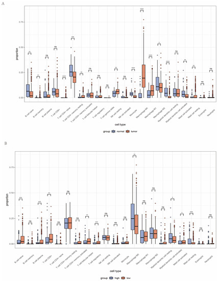 The immune landscape of HNC was displayed via the TIMER algorithm. It serves as a comprehensive resource for the systematical analysis of immune infiltrates across diverse cancer types. The immune microenvironment analysis was performed on the TIMER 2.0 website (http://timer.cistrome.org/, accessed on 21 July 2022). This website utilizes machine learning and the CIBERSORT deconvolution algorithm to dig immune cells from a gene expression matrix in samples. Boxplots were used to show the differences in the abundance of different immune infiltrating cells in the TME of HNC samples between high and low AMI groups. In addition, the expression levels of several immune checkpoints between the high and low AMI groups were compared to predict the potential of AMI for immunotherapy efficacy.