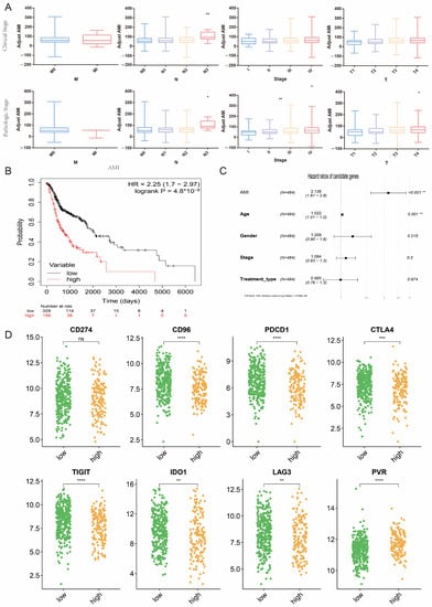 Statistical analyses were completed using the R software (version 4.1.3, http://www.R-project.org, accessed on 4 May 2022) and GraphPad Prism (version 6). The K–M analyses were accomplished on the Kaplan–Meier Plotter website (http://kmplot.com, accessed on 21 May 2022). The univariate Cox regression analysis was conducted to screen out the survival-related AMGs. The multivariate Cox regression analysis was exploited to identify the prognostic indicators of survival. The correlation matrix was analyzed via Pearson correlation. The statistical significance was determined as p < 0.05.