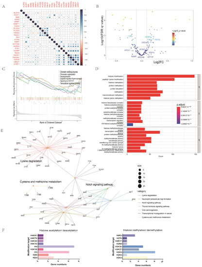 Based on the optimal cutoff of AMI, two groups were identified to analyze the association between amino acid metabolism and tumor immunity. In order to further explore the possible mechanisms behind this association, the limma algorithm was applied to identify DEGs between these two groups. The volcano diagram was used to demonstrate epigenetic genes that are differentially expressed between these two groups. Then, the COR function revealed the correlation between survival-related AMGS and epigenetic-related genes. We downloaded the epigenetics-related gene set on the website (https://epifactors.autosome.org/, accessed on 13 August 2022). This gene set includes 720 genes. In addition, the database provides annotations for each gene, including their modification targets and modification functions. DESeq2 package was applied to obtain the epigenetic-related genes differentially expressed between high and low AMI groups. The functions of these differentially expressed genes were then searched in the database and summarized according to the modification types. Figure 8D,F summarize the modification targets of these differential genes according to different histone modification modes.