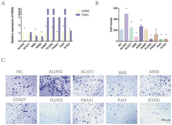 We cultured the normal oral epithelial cell line HOEC and the human pharyngeal cancer cell line FaDu. RT-qPCR was applied to compare the expression levels of AMGs between normal and tumor cells. The results showed that the relative expression levels of ALDH2, P4HA1, PAH, PLOD2, and KYNU were consistent with the results of bioinformatics analysis (Figure 9A). Furthermore, we applied siRNA to downregulate the expression level of these nine AMGs in FaDu cells. RT-qPCR was applied to confirm the reduced expression levels of these 9 genes (Figure S5).The invasion assay showed that the downregulation of ALDH2 expression significantly increased the invasion ability of tumor cells. The interference of the expression levels of SMS, P4HA1, PAH, PLOD2, and KYNU significantly decreased the invasion of tumor cells. However, the downregulation of ASNS, ACAT1, and GNMT expression had no significant impact on tumor invasion (Figure 9B,C).