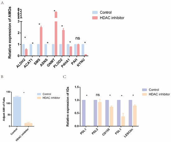 Epigenetic agents affect the relative expression levels of AMGs, immune-related genes, and AMI. (A) Relative expression level of AMGs in control and treatment groups. (B) AMI in control and treatment groups. (C) Relative expression level of immune-related genes in control and treatment groups. (ns = not satistically significant, * means p < 0.05. AMG = amino acid metabolism-related genes, AMI = amino acid metabolism index).