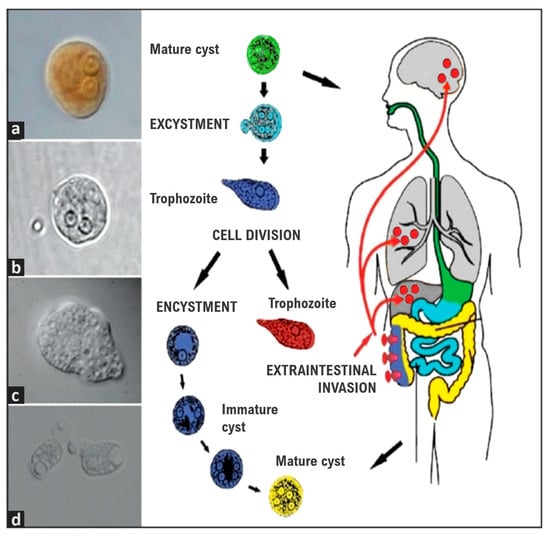 - Vaisusuk, K.; Saijuntha, W. Intestinal Protozoa: Their Role as Human Pathogens and Zoonoses. In Biodiversity of Southeast Asian Parasites and Vectors Causing Human Disease; Petney, T.N., Saijuntha, W., Mehlhorn, H., Eds.; Parasitology Research Monographs; Springer Nature Switzerland AG: Cham, Switzerland, 2021; pp. 35–61. ISBN 978-3-030-71161-0. [Google Scholar]