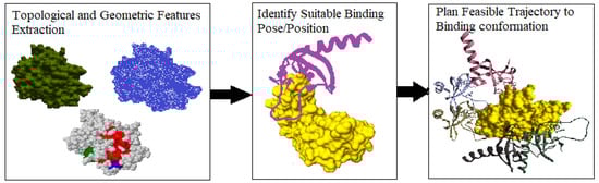 An important area of study includes understanding how a protein binds to another protein’s active site and what conformational changes both molecules undergo during docking to the active site or exit from it. Such information allows for predicting the possibility of an association between protein–protein pairs, the strength of this association, and the protein activity level. Protein function evaluation is a challenging task approached by various sequence-based and structural-based methods []. However, the fact that the function of a protein is intrinsically related to its 3D conformation (more than to its primary sequence) motivates the use of structure in predicting protein function [,]. During protein–protein interactions, the geometrical structure of the underlying topological manifold plays crucial roles that affect specific biologically related functions, such as driving the cellular immune response []. To this end, various developed computational approaches predict the 3D conformation for molecular docking [,,,], where the bio-molecules bind to the protein regions with potential coherence in the matching (concave) curvatures. The authors of [] presented an AutoDock-based incremental protocol (DINC) that addresses the limitations of AutoDock’s standard protocol by enabling improved docking of large bio-molecules. DINC performs docking using AutoDock incrementally instead of in one single step by dividing the docking problem into smaller sub-problems.