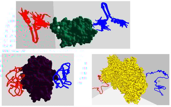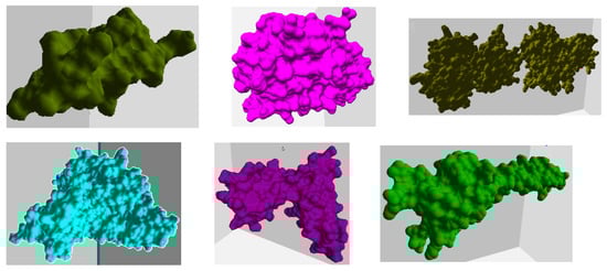 Figure 3 shows the surface models of six PF pathogen proteins, and Figure 4 shows a random combination of IDPs interacting with the remaining three proteins at their start (red) and goal (blue) positions. We conducted tests on every PF protein complex with all 6 IDPs, resulting in a total of 54 protein–protein complexes. The details for these interactions can be found in Table 1.
