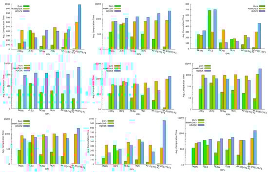 The plots show the total computation time taken (in seconds) by all three methods to predict the top 10 IDP docking conformation ensembles around the protein surface model. The results in the plots are shown for PF protein conformation space in the sequence as 1SQ6, 1TQX, 2MU6, 3NTJ, 3SRI, 4JUE, 4M1N, 6ZRY, and 7F9K.