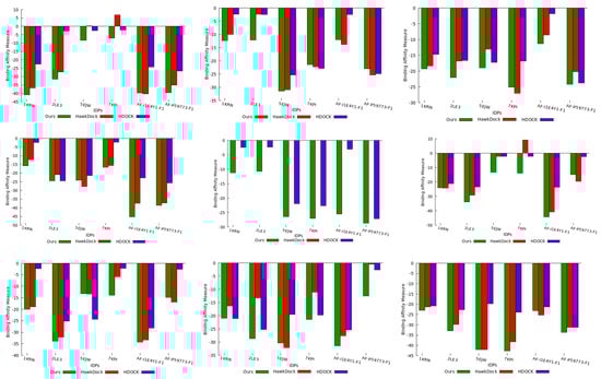 The plot shows the binding affinity measures for the topmost IDP docking conformations predicted by the three methods. The results in the plots are shown for PF protein conformation space in the sequence as 1SQ6, 1TQX, 2MU6, 3NTJ, 3SRI, 4JUE, 4M1N, 6ZRY, and 7F9K.