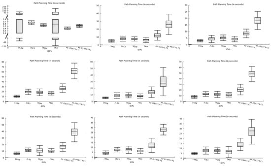 The total time taken (in seconds) to plan a path for all IDPs in each protein’s conformation space. The results in the plots are shown for PF protein conformation space in the sequence as 1SQ6, 1TQX, 2MU6, 3NTJ, 3SRI, 4JUE, 4M1N, 6ZRY, and 7F9K.