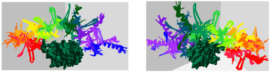 Figure 8 displays screenshots of the planned path for the 2LE3 IDP around the 1SQ6 protein surface, depicting the motion of the IDP biomolecule from its initial position to the experimentally predicted binding pose conformation. Different view angles illustrate the IDP’s movement around the protein surface, and the intermediate conformations represent the IDP conformations generated during feature extraction, serving as waypoints. These intermediate conformations between the starting and goal positions demonstrate the structural transformations of the 2LE3 IDP as it moves in the vicinity of the 1SQ6 protein surface. Similar movements and structural arrangements occurred for the remaining IDPs across different protein conformation spaces.