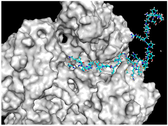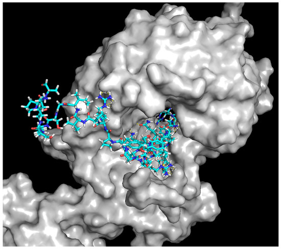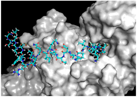 Docking studies were performed in order to estimate the binding interactions of antibiotics and compare the results with those of the studied peptides: P1, P2, and P3. Docking studies revealed that levofloxacin showed better binding affinity (−7.7 kcal/mol) than did peptide P1 (−7.0 kcal/mol) and P3 (−6.6 kcal/mol). The amino acids involved in the formation of hydrogen bonds with Topoisomerase IV are presented in Table 5. The visualisation of the interaction of the peptides with Topoisomerase IV is presented in the form of 3D models in Figure 2 and Figure 3.