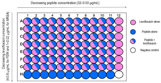 After the MIC50 determination for P1 (E. faecalis) and P3 (E. faecalis, S. aureus), a synergy checkerboard assay was performed. Columns 1 to 11 contain 2-fold serial dilutions of P1 or P3 which start from earlier-obtained MIC50 values, and rows A to G contain 2-fold serial dilutions of levofloxacin. Levofloxacin was selected for this study as the reference antibiotic for tested strains. Column 12 contains a serial dilution of levofloxacin alone, while row H contains a serial dilution of Compound A alone. A detailed scheme of plate preparation for the checkerboard assay is presented at Figure 6.