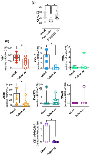The amplified ACTB mRNA and the EMT gene profile of the purified CD45−CD146+ABCB5+ subpopulation of CMCs correlate with patients’ clinical outcomes. (a) Analysis of the Ct of the internal reference gene ACTB in CD45−CD146+ABCB5+ subpopulation purified from PB of patients at onset and after six months of therapy and clinically classified as in disease remission or progression. One-way ANOVA * p < 0.05. (b) Expression of the EMT-related genes in CD45−CD146+ABCB5+ CMCs isolated from patients at onset and at follow-up (after six months of therapy). Student’s t-test * p < 0.05. Data are presented as box and whiskers boxplots including the single values obtained from each patient.