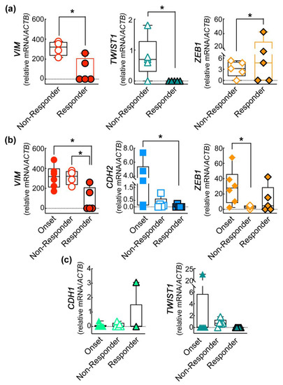 To extend our analysis, we included the mean of the expression of each gene determined in patients at onset in the statistical analysis. Interestingly, we found that VIM expression decreases significantly in responder patients in comparison to both the onset and non-responder patients. Additionally, the expression of the mesenchymal marker CDH2 also impressively decreased in the responder patients, almost zeroing in some cases, compared to the onset levels. Of note, we observed a drastic decrease in the non-responder patients in the level the EMT TF ZEB1 with respect to the onset status (Figure 2b). The increase of CDH1 expression observed in responder patients is promising, which, as expected, showed an opposite trend compared to CDH2, as well as of the EMT TF TWIST1 (Figure 2c), even if not statistically significant.