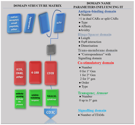 In CAR-T design, domains are sometimes referred to as modules [8]. This emphasises the technology’s modular character, with a virtually endless number of possible combinations of different domains making up the construct [9]. This concept of the “structural matrix” is exemplified in Figure 2, which aims to represent the most general possible structure for a CAR construct. Although in a “typical” CAR, the role of antigen-binding domain is filled by an antibody-derived scFv, other options reported in literature are Nanobodies [10], truncated versions of an scFv mainly featuring the heavy chains (VH), or native receptors, or even small peptides like the so-called peptide-centric [11] and SPEAR [12] CAR-Ts designs. Under each domain, parameters which influence its activity are indicated. For instance, the antigen-binding domain activity is affected by the number of “domains”, which can vary for specific constructs (e.g., dual CAR-T share two domains), but it is also influenced by the type of protein chosen to derive the antigen-binding domain, by its affinity and/or avidity for the antigen, or by the interaction of different CAR constructs’ affinities on a single CAR-T-cell surface. Each property originates different behaviours and cytologic phenomena which overall may influence the behaviour of the CAR in vivo, thus impacting its safety and efficacy profile [13].
