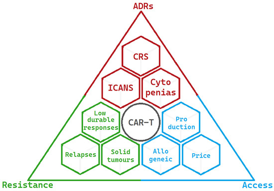 Limitations and challenges of CAR-Ts at present are summarised into three main areas. The most significant adverse drug reactions are in red, the factors resulting in resistance to CAR-T activity are in green, and the factors limiting access to CAR-T-cell therapy are in blue.