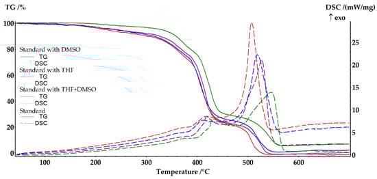 The Figure 1 displays thermograms of cured epoxy vinyl ester resin samples in the presence of cobalt octoate catalyst and different solvents. All samples were treated at a temperature of 120 °C for 2 h after curing. The impact of the introduced solvents on the thermal properties of the polymers is also shown. All samples behave similarly up to 120 °C, indicating the removal of all volatile components during post-curing. At temperatures above 120 °C, a small mass drop is observed without a visible response to the TG curve, indicating the removal of unbound styrene residues. Above 160 °C, the destruction process starts, accompanied by an exothermic peak in the DSC curves, and the mass loss steps are identical for all samples.