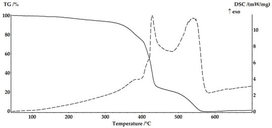 To investigate the thermal properties of the cured resin samples, measurements were conducted using a simultaneous thermal analysis device. The results of differential scanning calorimetry (DSC) and thermogravimetric (TG) analysis of selected cured samples, taken in heating mode from 40 to 700 °C with a heating rate of 10 K/min, are presented in Figure 1 and Figure 2.