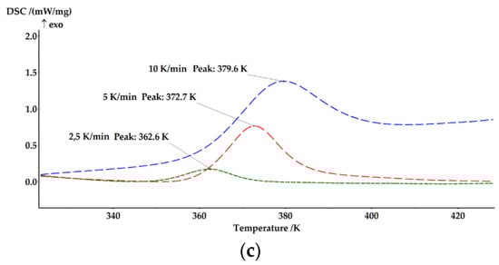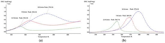 A thermal analysis of the samples was performed on an STA 409 PC Luxx simultaneous thermal analyzer manufactured by NETZSCH-Gerätebau GmbH. Thermogravimetric (TG) and differential scanning calorimetric (DSC) data were recorded during the experiment. The analysis was carried out in corundum ceramic crucibles. The heating was carried out at the rate of 10 K/min in the air. A study of the kinetics used to cure the binder with various catalysts was carried out using the Kissinger method [67,68]. In this case, the experiment was carried out at three different rates of 2.5, 5 and 10 K/min.