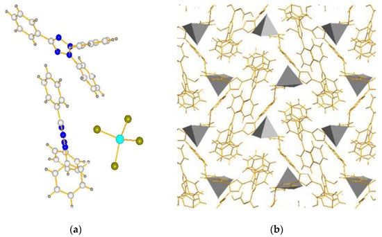 Crystal structure of complex (TPhTz)2[CuBr4]: (a) Unit; (b) Cell (C—white, N—blue, H—grey, Cu—sky blue, Br—yellow, tetrahedron - the coordination polyhedron of [CuBr4]2−).