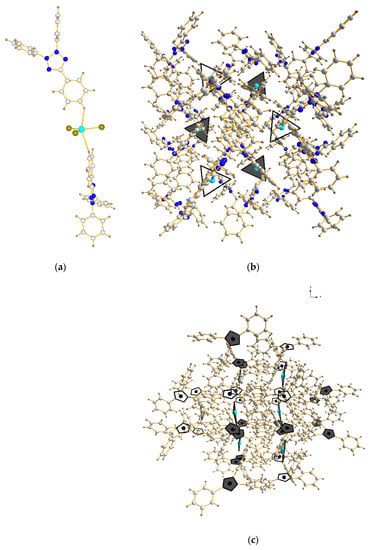 Crystal structure of complex (TPhTz)2[CuBr3]: (a) Unit; cell: (b) view 1, (c) view 2 (C—white, N—blue, H—grey, Cu—sky blue, Br—yellow, triangle- the coordination polyhedron of [CuBr3]2−, pentagon with the black center—tetrazolium π system.