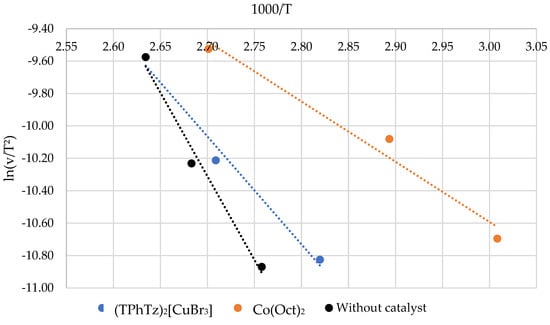 The curing process kinetics of systems containing the standard cobalt octoate catalyst, the (TPhTz)2[CuBr4] and only the initiator were studied to establish the catalytic effect of the complex. The analysis was conducted under non-isothermal heating using the Kissinger approach. The heating rates used were 2.5, 5, and 10 K/min. The results are presented in Figure 3.