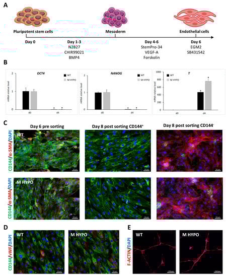 Differentiation of iPSCs towards endothelial-like cells: (A) Schematic diagram of the experimental protocol. (B) qRT-PCR analysis for pluripotent markers (OCT4, NANOG) and mesoderm marker (T) during EC differentiation. Results were normalized by HPRT and expressed relatively to the undifferentiated control (n = 3). Data are means ± SD; * p < 0.05 vs. corresponding day 0. (C) Representative immunofluorescence images for the expression of CD144 (vascular endothelial cadherin) and α-SMA on EC-WT (upper panels) and EC-M HYPO (lower panels) pre and post sorting. Scale bars: 50 μm. (D) Expression of CD144 and vWF (von Willebrand factor) by immunofluorescence of EC-WT (left) and EC-M HYPO (right). Scale bars: 50 μm. (E) In vitro tube formation assay of EC-WT (left) and EC-M HYPO (right). Scale bars: 250 μm.