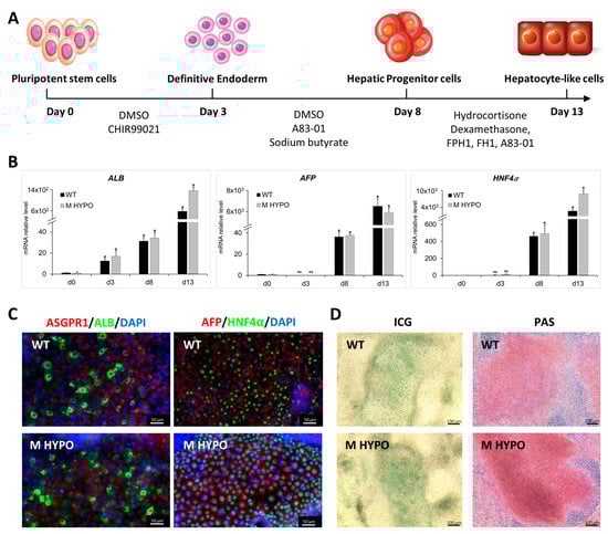 Differentiation of iPSCs towards hepatocyte-like cells: (A) Schematic diagram of the differentiation protocol. (B) qRT-PCR analysis of hepatic markers ALB (Albumin), AFP, and HNF4α (Hepatocyte Nuclear Factor 4 alpha) on iPSC-HLCs at various differentiation time points. Results were normalized using HPRT and expressed as fold versus day 0 (n = 3). Data are means ± SD; * p < 0.05 vs. corresponding day 0, day 3, and day 8; ns: not significative. (C) Immunofluorescence for ASGPR1 (Asialoglycoprotein 1), ALB, HNF4α, and AFP of differentiated cells, HLC-WT (upper panel) and HLC-M HYPO (lower panel). Scale bars: 50 μm. (D) Analysis of ICG uptake (left) and PAS staining (right). Scale bars: 100 μm.