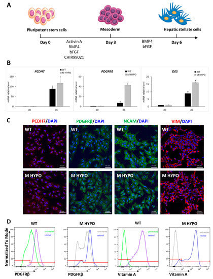 Differentiation of iPSCs towards hepatic stellate-like cells: (A) Schematic representation of the differentiation protocol. (B) qRT-PCR analysis of HSC markers (PCDH7, PDGFRβ, and DES). Results were normalized to HPRT mRNA levels and expressed as fold versus day 0. Data are means ± SD of three independent experiments; * p < 0.05 vs. corresponding day 0. (C) Immunofluorescence analysis for PCDH7, PDGFRβ, NCAM, and VIM in iPSC-HSCs from WT (upper panel) and M HYPO (lower panel) at the end of the differentiation protocol. Scale bars: 10 μm. (D) Representative overlay histogram plots of flow cytometry analysis of iPSC-HSCs showing PDGFRβ-positive cells and vitamin-A-positive cells at the end of a 4-day retinol treatment. The red line divides negative (on the left) from positive (on the right) marker expression.