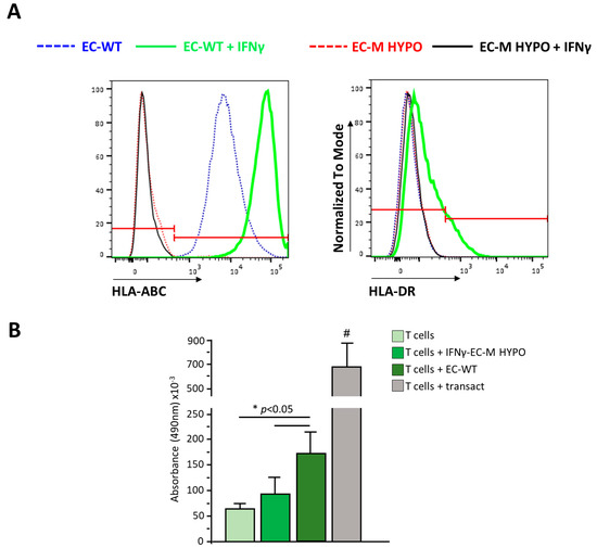 (A) Representative overlay histogram plots of flow cytometric analysis of HLA-ABC and HLA-DR expression in untreated and IFNγ-treated endothelial cells derived from WT or M HYPO cells. The red line divides negative (on the left) from positive (on the right) marker expression. (B) Proliferation of T cells in resting condition, after coculture with endothelial cells derived from WT or M HYPO iPSCs or after stimulation with Transact, as positive control. # p < 0.05 vs. all. Data are means ± SD of three independent experiments.