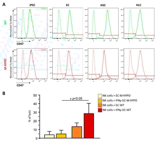 (A) Representative overlay histogram plots of flow cytometric analysis of CD47 expression in undifferentiated and differentiated WT (green) and M HYPO (red) iPSCs, and the respective isotype controls (dashed line). The red line divides negative (on the left) from positive (on the right) marker expression. (B) LDH release assay after allogeneic natural killer coculture with EC-M HYPO and EC-WT cells treated or not with IFNγ. Data are means ± SD of three independent experiments. * p < 0.05 vs. corresponding WT.