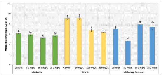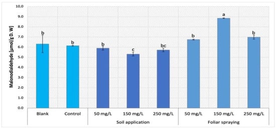 Malondialdehyde (MDA) content in tomato leaves of Maskotka cultivar. Vertical bars are used to display all data, which are the means of 3 replicates (±SD). Different letters indicate the significant differences for p-value ≤ 0.05.