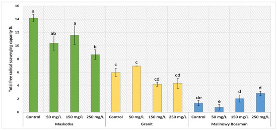 The total antioxidant activity was measured by DPPH method and expressed as free radical scavenging capacity. For cultivars Maskotka, Granit and MB the results obtained after NPs treatment were demonstrated in Figure 3.