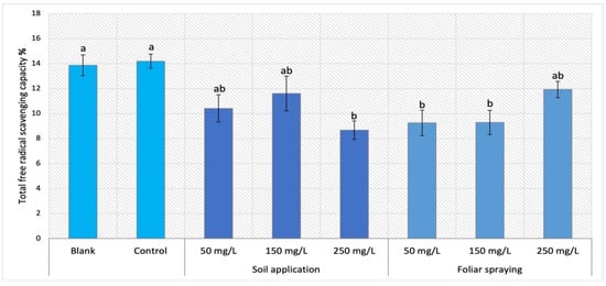 Total free radical scavenging capacity in tomato leaves of Maskotka cultivar. Vertical bars are used to display all data, which are the means of 3 replicates (±SD). Different letters indicate the significant differences for p-value ≤ 0.05.