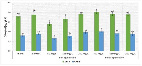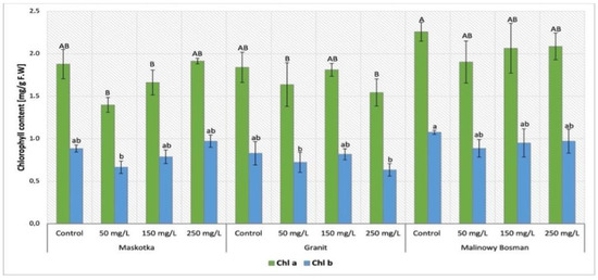 Chlorophyll (chl a and chl b) content in tomato leaves of Maskotka cultivar. Vertical bars are used to display all data, which are the means of 3 replicates (±SD). Different letters indicate the significant differences for p-value ≤ 0.05.