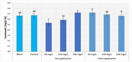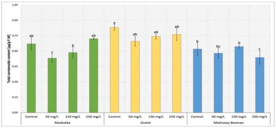 Carotenoid content in tomato leaves of Maskotka cultivar. Vertical bars are used to display all data, which are the means of 3 replicates (±SD). Different letters indicate the significant differences for p-value ≤ 0.05.