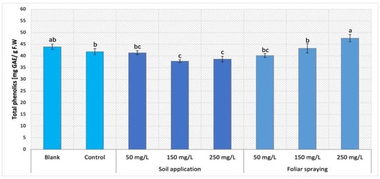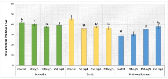Total phenolic content in tomato leaves of Maskotka cultivar. Vertical bars are used to display all data, which are the means of 3 replicates (±SD). Different letters indicate the significant differences for p-value ≤ 0.05.