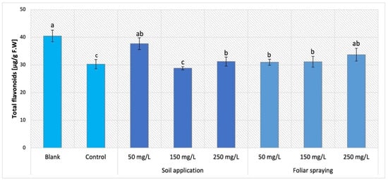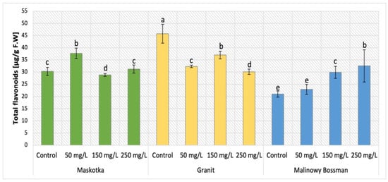 Total flavonoid content in tomato leaves of Maskotka cultivar. Vertical bars are used to display all data, which are the means of 3 replicates (±SD). Different letters indicate the significant differences for p-value ≤ 0.05.