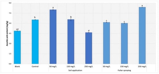 Ascorbic acid content in tomato leaves of Maskotka cultivar. Vertical bars are used to display all data, which are the means of 3 replicates (±SD). Different letters indicate the significant differences for p-value ≤ 0.05.