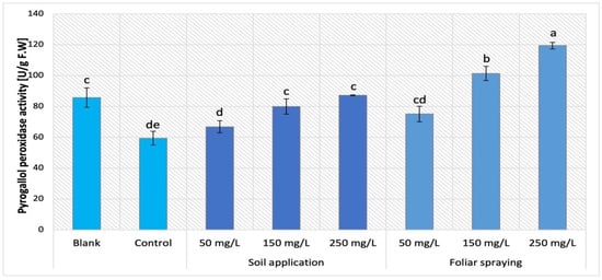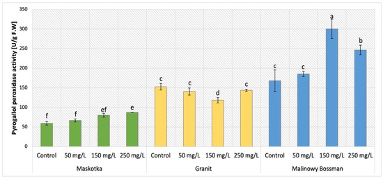 Pyrogallol peroxidase (POX) activity in tomato leaves of Maskotka cultivar. Vertical bars are used to display all data, which are the means of 3 replicates (±SD). Different letters indicate the significant differences for p-value ≤ 0.05.