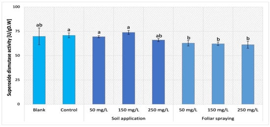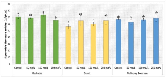Superoxide dismutase (SOD) activity in tomato leaves of Maskotka cultivar. Vertical bars are used to display all data, which are the means of 3 replicates (±SD). Different letters indicate the significant differences for p-value ≤ 0.05.