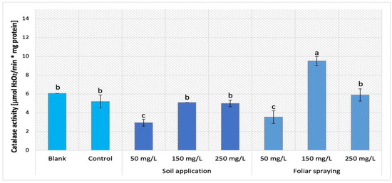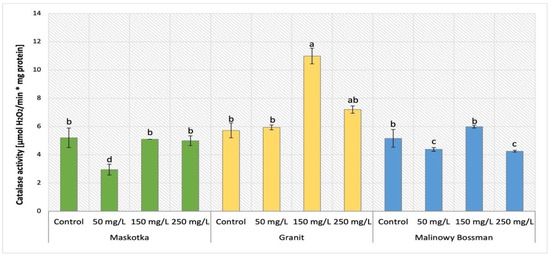 The analysis of catalase activity in tomato leaves of Maskotka cultivar. Vertical bars are used to display all data, which are the means of 3 replicates (±SD). Different letters indicate the significant differences for p-value ≤ 0.05.