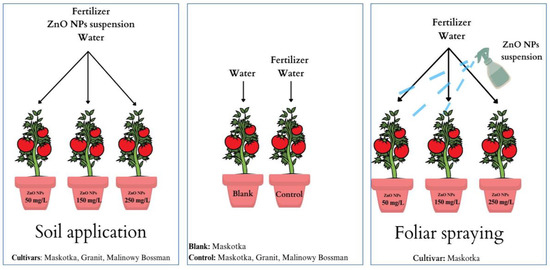 Solanum lycopersicum L., commonly known as tomato, is a highly esteemed horticultural crop that contains various health-promoting constituents, including carotenoids. These carotenoids, along with other antioxidants such as lycopene, are responsible for the characteristic red color of tomatoes. In addition, it is noteworthy that fresh tomato fruit is found to contain roughly 12 mg/100 g of lycopene, alongside other carotenoids such as β-carotene, phytoene, and lutein. Several studies suggest that these health-promoting compounds may reduce the risk of cancer. Furthermore, the ingestion of tomatoes and their carotenoid constituents is advised for safeguarding against cardiovascular diseases and decreasing the likelihood of contracting other illnesses such as colon, stomach or rectal cancer [1,2,3,4]. Tomatoes are a rich source of various nutrients, including vitamins and polyphenols such as anthocyanins and phenol acids. The peel of tomatoes also contains a small amount of flavonoids [5]. The aforementioned category of substances comprises naringenin, chalcone, flavonol, rutin and quercetin glycoside. Apart of the popularity of tomato plants and the fact that those crop plants are cultivated all over the world, the increasing human population has forced the agricultural sector to increase crop productivity in order to fulfil the needs of billions of people [6]. Producing enough food for the world’s increasing population has become a serious problem. Moreover, the agriculture sector faces many problems such as finding an ecologically friendly but at the same time efficient way to grow crop plants properly. This situation may require the use of new technologies in the area of crop fertilization. The conventional bulk fertilizers are becoming less effective and have negative impacts on the environment. The increasing production efficiency, the requirements of food safety and environmental protection should be provided immediately. Nanotechnology in the form of nanofertilizers may be the solution for improving the efficiency and safety of fertilization. An example of nanomaterials that can be used in future as a potential nanofertilizer are zinc oxide nanoparticles (ZnO-NPs) which are widely used in many other sectors like medicine or electronics.