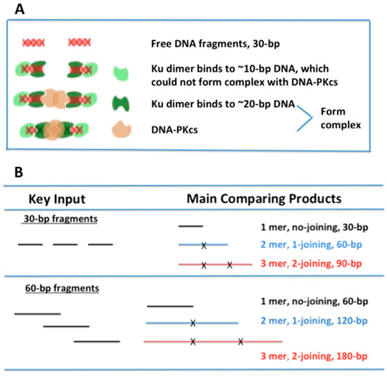 Figure 1. Hypothesis and major comparison of products. (A) Hypothesis: 1-joining (2-mer) products for 30-bp DNA fragments were one of the major sources of interference with cNHEJ. One end of the DNA fragment was properly bound by the Ku70/80 dimer (occupied ~20 bp at each end of the DSB), which formed a functional complex with DNA-PKcs. The two functional DNA/Ku/DNA-PKcs complexes from each end of the fragment were then joined together. However, the other end of the fragment had only ~10 bp remaining, lacking sufficient space for proper binding by Ku. As a result, Ku was unable to recruit or activate DNA-PKcs, and this end became a “dead end” that blocked further repair. (B) Description of the key input (30- and 60-bp dsDNA) and the major comparison of products for the experiments.