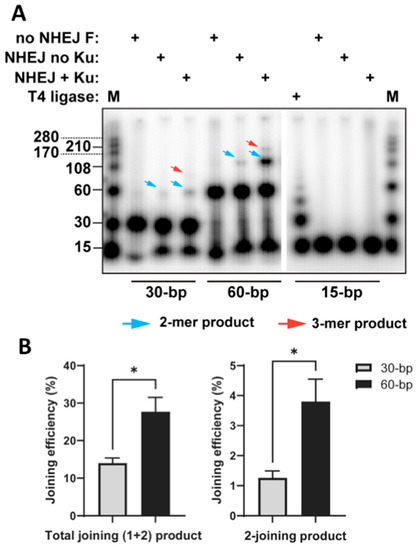 Figure 2. Size dependence of end-joining efficiency through cNHEJ. (A) The end-joining reaction was performed as described in Section 4. T4 ligase was used as a positive control. Blue arrow: 2-mer (1-joining) products; red arrow: 3-mer (2-joining) products (see Figure 1B). (B) Quantification of end-joining efficiencies. The standard error of the mean was derived from three independent experiments. The efficiency of end-joining was calculated as the percentage of the joined signals to the total signals. Total joining efficiency was calculated as follows: (2-mer + 3-mer)/(1-mer + 2-mer + 3-mer); 2-joining efficiency was calculated as follows: 3-mer/(1-mer + 2-mer + 3-mer). * p< 0.05.