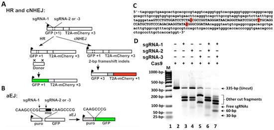 Figure 3. Reporter cassettes containing sgRNAs/Cas9 digestion sites. (A) Reporter of the cNHEJ/HR pathway. A promoter was linked to a GFP cDNA at transcriptional reading frame +1 that was interrupted by an intervening sequence containing target sites of sgRNA-1, 2, and 3. A T2A-linked mCherry cDNA was located downstream with a transcriptional reading frame + 3. The arrow denotes the promoter. Co-delivering a donor template with Cas9/sgRNA allowed HR to repair the digested DSBs, which restored GFP expression through gene conversion. (B) Reporter of the aEJ pathway. An intervening fragment including three sgRNA target sites followed by a stop codon separated a promoter and a downstream GFP cDNA. The cassette was flanked by two 8-nucleotide homologous sequences. These Cas9/sgRNA-induced DSBs were repaired through the microhomology-mediated aEJ pathway, which activated GFP expression. (C) The sequence of DNA substrate used for in vitro Cas9/sgRNA digestion. The sequence in capitals represents one inserted into the two (cNHEJ/HR and aEJ) vectors. The red bars indicate sgRNAs that guided Cas9 digesting sites; the first was with sgRNA-1, the second was with sgRNA-2, and the third was with sgRNA-3. Combining Cas9 with sgRNA-1/2 generated 30-bp dsDNA, and sgRNA-1/3 generated 60-bp dsDNA. (D) Cas9/sgRNA digestion products. These sgRNAs were designed using the CHOPCHOP toolbox. Detailed information is provided in Section 4.