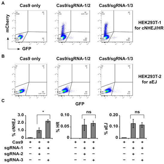 Figure 4. cNHEJ, but not HR or aEJ, show less efficiency for joining 30-bp than 60-bp dsDNA. (A) The flow cytometry plots were obtained from HEK293T-1 cells transduced with Cas9/sgRNAs (Table 1) plus donor vector. mCherry signals (in the Q1 area) represent cNHEJ of the Cas9/sgRNA-digested DSBs, and GFP signals (in the Q3 area) represent HR repair of the Cas9/sgRNA-digested DSBs. The signals in the Q2 area represent both mCherry and GFP positive signals that should not exist and were not present in this study. The Q4 signals represent those sorted cells without mCherry or GFP signals. Complete data are shown in Table 2, Figures S1 and S2, and Table S1. (B) GFP signals in the Q3 area represent aEJ of the Cas9/sgRNA-digested DSBs. Complete data are shown in Table 2, Figures S3 and S4, and Table S2. (C) Quantification of the relative efficiencies of cNHEJ, HR, or aEJ in repairing Cas9 with sgRNA-1/2-induced DSBs (containing 30 bp) and Cas9 with sgRNA-1/3-induced DSBs (containing 60 bp). The data represent the mean ± standard deviation from Table 2, Table S1 and Table S2. * p < 0.05; ns, no significant difference.