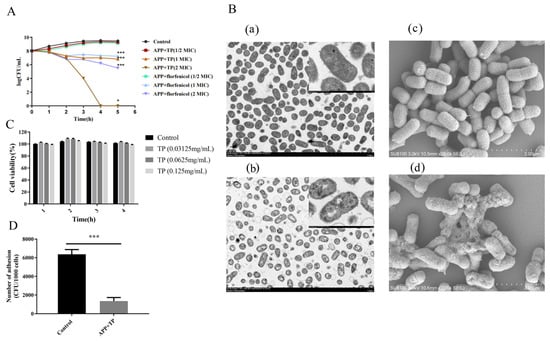 (A): Kinetics of the antimicrobial effects of TP on APP. APP and TP (0 MIC, 1/2 MIC, 1 MIC, and 2 MIC) were co-cultured for 0, 1, 2, 3, 4, and 5 h. The number of colonies was counted, and kinetics curves were constructed. (B): Transmission electron microscope and scanning electron microscopy analysis of APP. (a): Control untreated bacteria via TEM, the bar at the bottom right means 5.0 µm. High-magnification image of area indicated in upper right corner, the bar at the bottom right means 500 nm. (b): Bacteria treated with TP via TEM, the bar at the bottom right means 5.0 µm. High-magnification image of area indicated in upper right corner, the bar at the bottom right means 500 nm. (c): Untreated bacteria control analysis via SEM, the bar at the bottom right means 2.0 μm. (d): Bacteria treated with TP analysis via SEM, the bar at the bottom right means 2.0 μm. (C): The cell viability of NPTr cells of TP treatment. (D): The adherent ability of APP to NPTr cells or NPTr cells pretreatment with TP. Statistical analysis was performed by Student’s t-test. n = 3 in each group. Results are expressed as the mean ± SD of three independent experiments. * p < 0.05, *** p < 0.001.